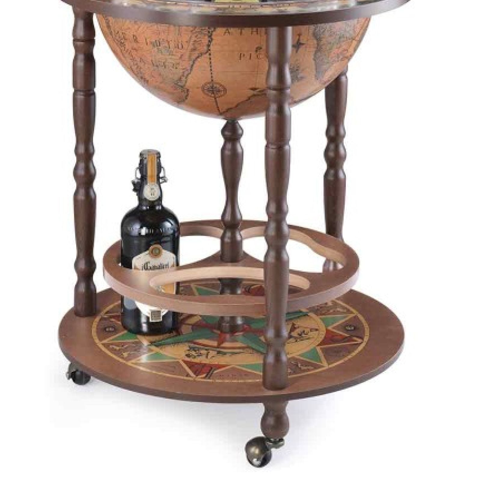 Supported by three solid beech wood legs and a finely decorated base featuring the Rosa dei Venti (rose of the winds), this globe is both sturdy and elegant. The laminated MDF shelves inside offer room to store 2-3 bottles and 4-6 glasses, while the globe itself rotates smoothly on its axis, even when open. The built-in wheels make it easy to roll this piece of history from one room to another.